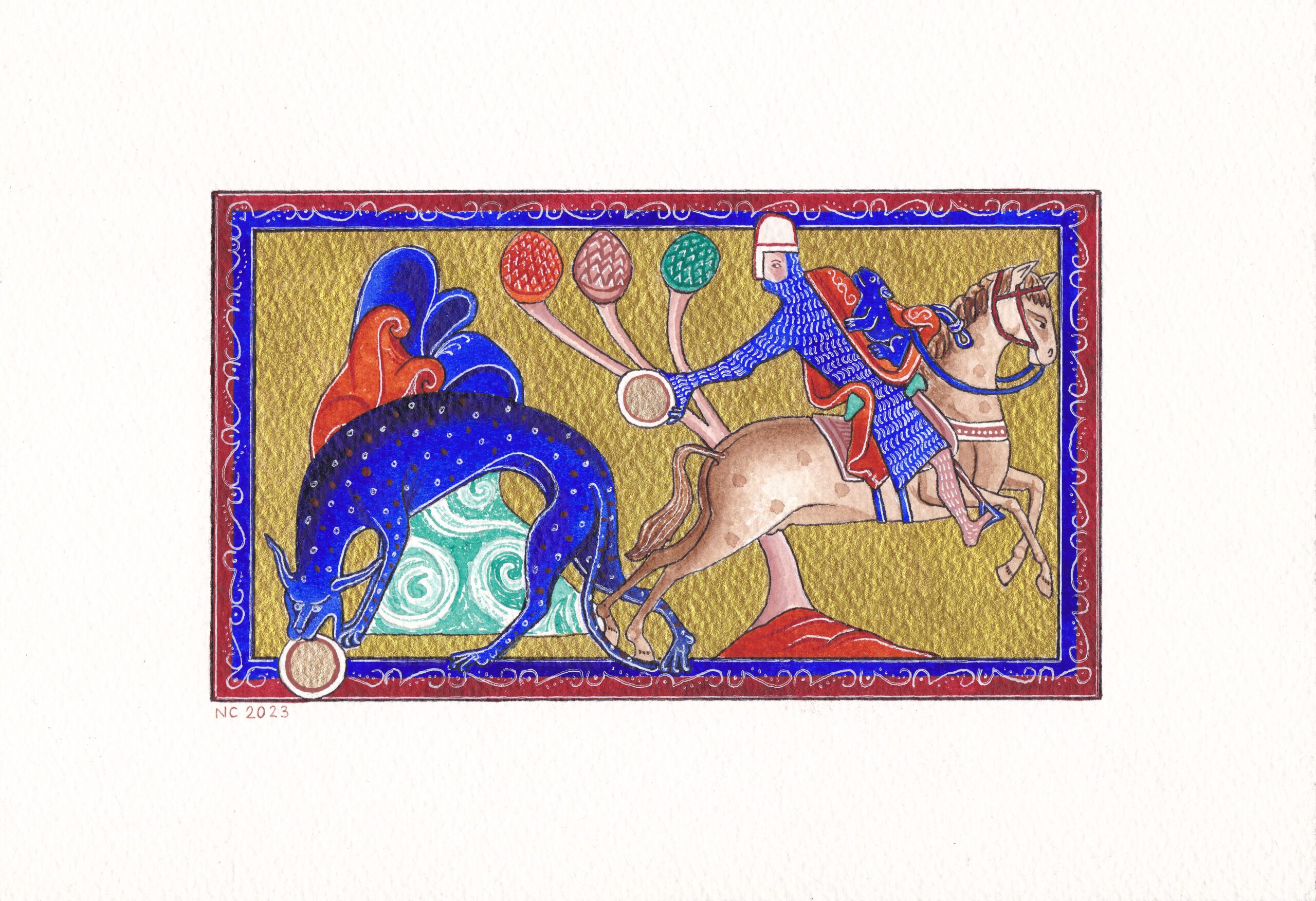 A hand-painted illumination. This is a tigress, as seen in the Aberdeen Bestiary. A knight throws a glass ball to the tigress. Fascinated by her reflection, she abandons her cub, and the man captures it. Golden watercolor, homemade colors made from powdered pigments and a medieval binder, on Arches watercolor paper. Please allow up to two weeks for me to paint and ship this illumination, if not in stock. Not two paintings can be the same, so please allow minor differences with the pictured illumination. Sent with a tracking number.